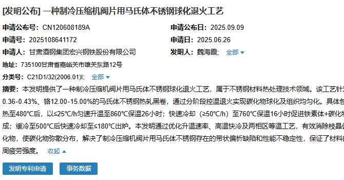 酒鋼宏興申請(qǐng)“一種制冷壓縮機(jī)閥片用馬氏體不銹鋼球化退火工藝”專利