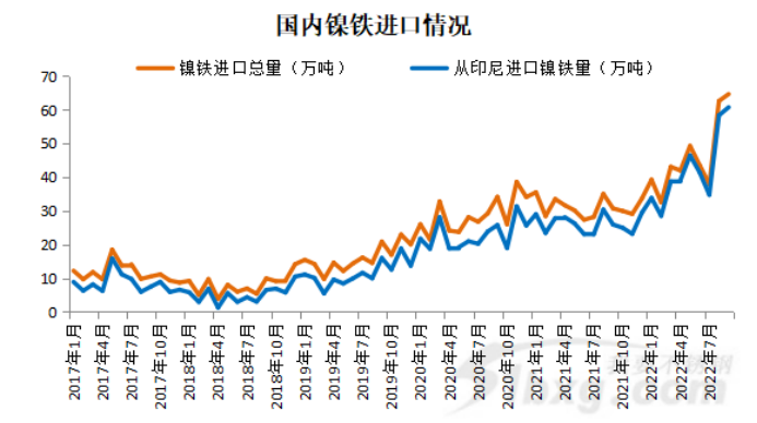 2022年1月~9月,國內(nèi)鎳鐵進(jìn)口總量為414.22萬噸,同比增47.94。其中,自印尼進(jìn)口鎳鐵為318.28萬噸,同比增61.14%。