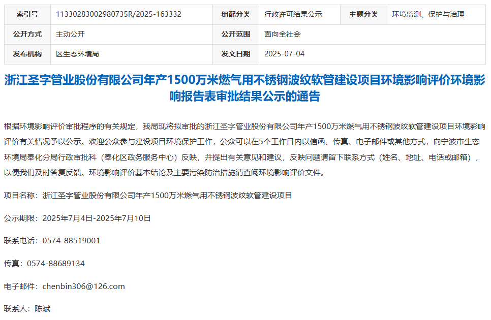 圣字管業(yè)年產(chǎn)1500萬米燃氣用不銹鋼波紋軟管建設(shè)項目環(huán)評獲批公示